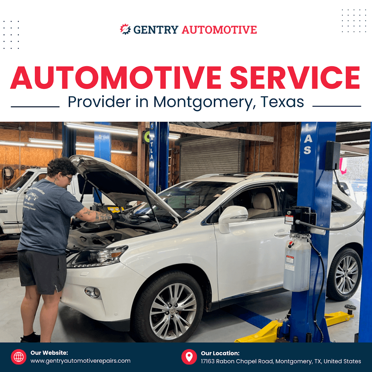 At Gentry Automotive, we are a trusted auto repair shop in Montgomery, TX, with over 42 years of experience delivering reliable vehicle maintenance and repair services. Our licensed and insured technicians handle everything from engine diagnostics, oil changes, brakes, and A/C repair for domestic, European, and Asian vehicles. We focus on honest pricing, quality workmanship, and customer satisfaction. Contact us today to schedule your service and drive with confidence!